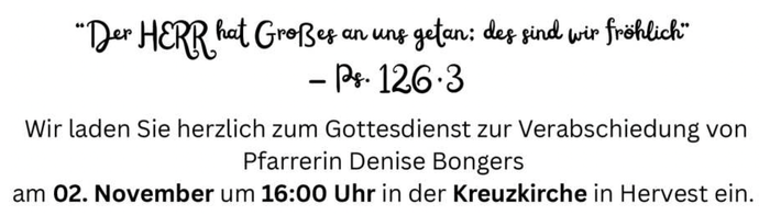Pfrn. Bongers tritt im November ihre neue Pfarrstelle in der Ev. Kirchengemeinde Wanne-Eickel an. Für sie ist es eine Rückkehr in ihre "alte Heimat". Als eine Pfarrstelle mit passendem Profil in ihrer Heimatgemeinde ausgeschrieben wurde, hat sich Pfrn. Bongers beworben und wurde im September schließlich gewählt. Das Presbyterium der Ev. Kirchengemeinde Hervest-Wulfen freut sich für Pfrn. Bongers und ihre beruflichen Perspektiven - gleichzeitig sind wir ebenso traurig über den Verlust. Mit vielen Ideen und Aktionen - auch mal abseits der üblichen Wege - hat Pfrn. Bongers in der Gemeinde viele Impulse gesetzt.