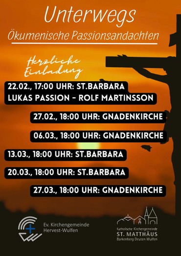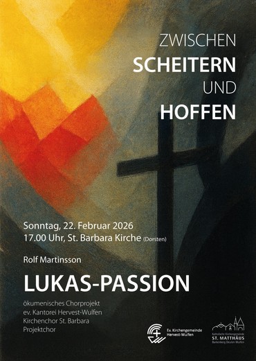 Mit unseren katholischen Geschwistern in Wulfen und Barkenberg, der Kirchengemeinde St. Matthäus, startet wenig später ein weiteres tolles Projekt. Im letzten Jahr haben wir erstmalig ökumenische Passionsandachten gefeiert und uns so mit kurzen Impulsen in der Woche auf Ostern vorbereitet. Auch dieses Jahr wird es wieder ökumenische Passionsandachten ab Aschermittwoch in der Gnadenkirche, Wulfen und St. Barbara, Barkenberg geben. In diesem Jahr gibt es allerdings einen ganz besonderen Auftakt zu den Passionsandachten: Am 22. Februar um 17:00 Uhr wird die Lukaspassion, komponiert von Rolf Martinsson, von einem Projektchor der beiden Kirchengemeinden unter der Leitung von Stephan Hillnhütter und Lukas Czarnuch aufgeführt. Die Lukaspassion von Martinsson ist in Deutschland wenig bekannt - in Schweden, ihrem Ursprungsland, wird sie mittlerweile öfter als die bachschen Passionen dargeboten. Herzliche Einladung auch dazu, der Eintritt ist frei. Informationen zur Lukaspassion und den Passionsandachten finden Sie ebenfalls in den Flyern. Wir freuen uns auf Sie!