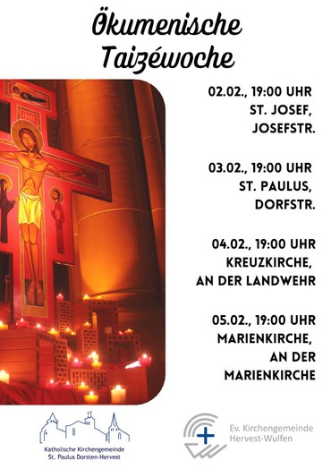 Vom 02. bis zum 05. Februar startet die alljährliche ökumenische Taizéwoche mit unseren katholischen Geschwistern aus St. Paulus. Wie in jedem Jahr werden wir vier Andachten an den vier verschiedenen Standorten der Kirchengemeinden in Hervest feiern. In der Marienkirche, St. Josef, St. Paulus und der Kreuzkirche singen wir Taizélieder, beten und kommen zur Ruhe. Wann und wo welche Andacht stattfindet, entnehmen Sie dem Flyer.