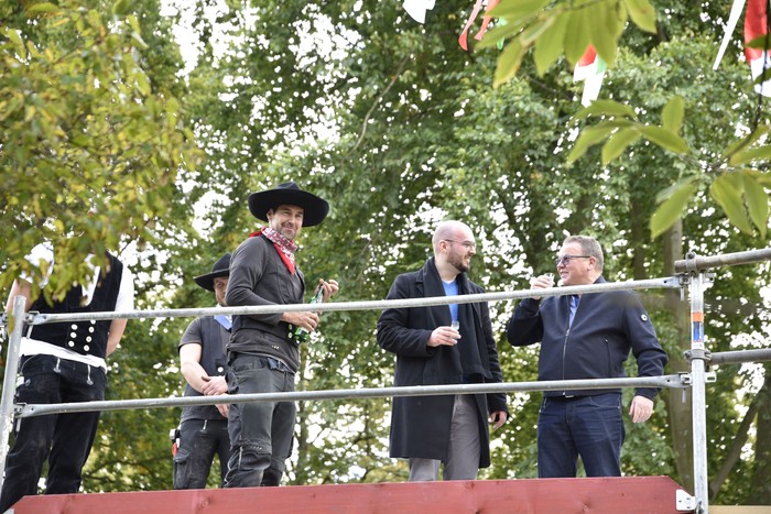 Nachdem der Richtkranz - geschmückt von Presbyterin Gudrun Winkel - über den fertigen Dachstuhl gehoben wurde, haben Kinder aus dem benachbarten Familienzentrum Regenbogen die Veranstaltung mit dem Regenbogenlied offiziell eröffnet. Pfarrer Hellmers begrüßte die Anwesenden mit einer Ansprache, im Anschluss überbrachte Superintendent Riesenberg Grüße aus dem Kirchenkreis.